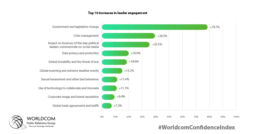 #7 The pandemic drives the most significant increases in leaders’ engagement. Government, and legislative change increased 79% from the 2019 level and crisis management rose by 40%
