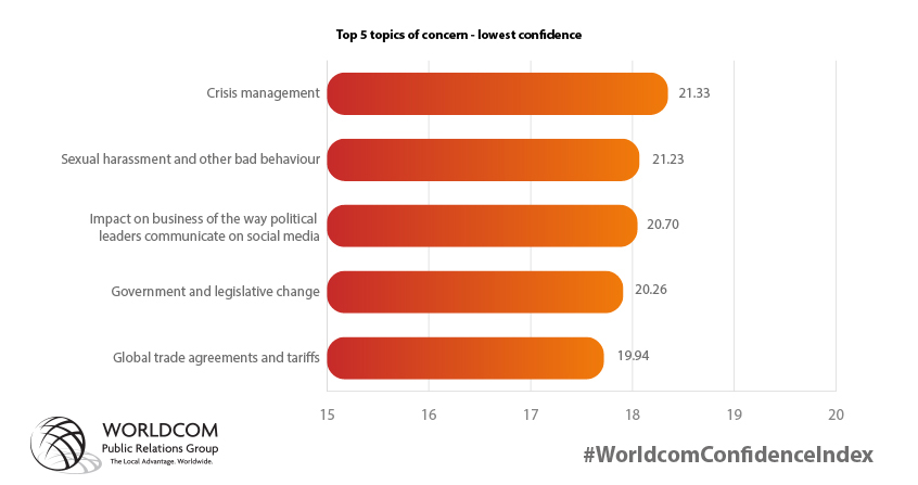 The Worldcom Confidence Index highlights concerns/confidence of over 54,000 CEOs and CMOs globally, across 23 topics and six audiences. The Worldcom Confidence Index 12, can be seen in more detail here.