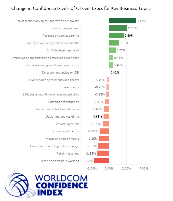 *The Worldcom Confidence Index (WCI) is the first AI-driven ‘living’ global market research, tracking the topics that over 80,000 CEOs and CMOs are commenting on online. The AI-fuelled tracker is updated monthly and is drawn from an active sample of over 100,000 C-Suite executives. It tracks data for two roles, six regions, 42 countries and 11 industry sectors. It identifies the levels of engagement with business topics and how much the level of confidence for each topic has changed. It is the first global study of this type to use AI supported data capture.