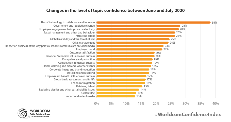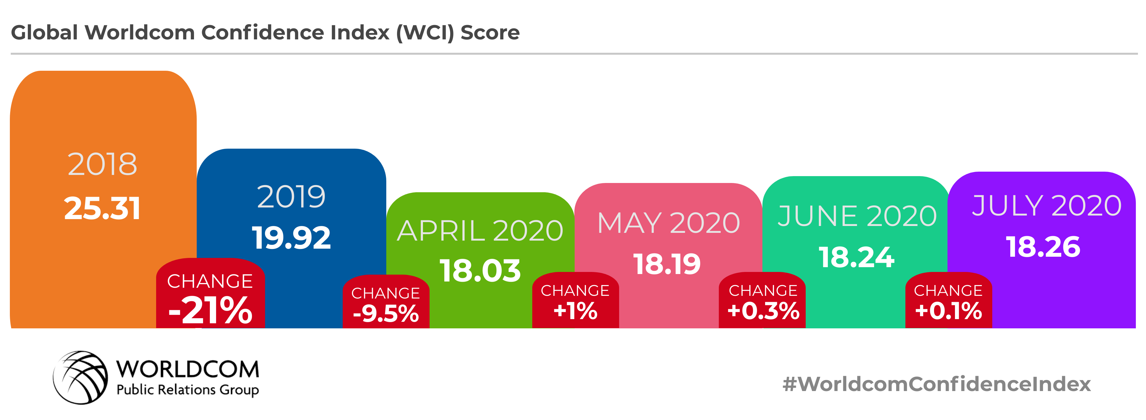 The Worldcom Confidence Index highlights CEO/CMO confidence and concerns across 23 topics and six audiences. We have outlined the top 10 findings for July in what we call “The Worldcom Confidence Index 10.” The July WCI 10 shows the main changes since June 2020.