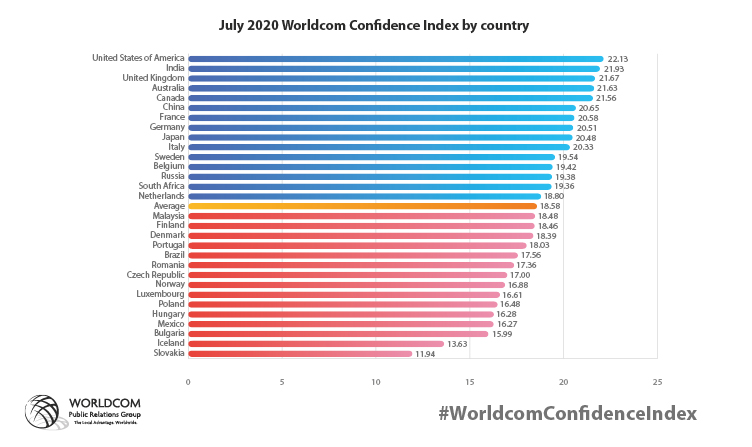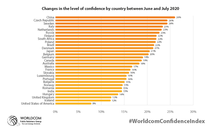 Worldcom Confidence Index (WCI) monthly report for July 2020 shows there was a marked increase in the confidence of leaders in countries emerging from the lockdown. Leaders in China had the highest increase – up 26% and the confidence of CEOs and CMOs from The Czech Republic, Sweden, Italy, the Netherlands, Russia, Finland, Poland, Denmark and Belgium increased between 20% and 24% from the June levels. As some of these countries have seen the virus reemerge since July, confidence levels may decline in August.