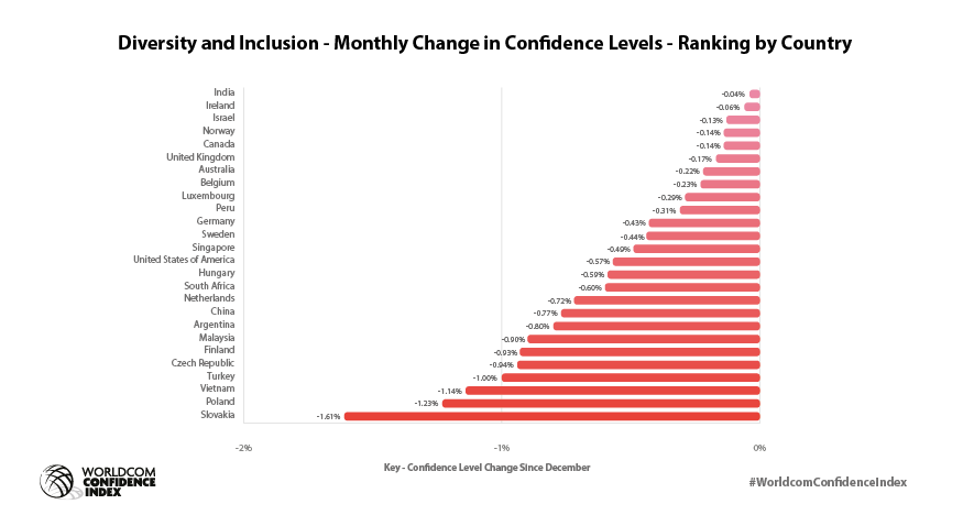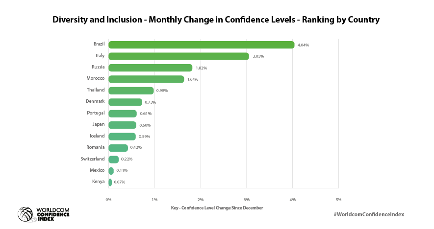The WCI provides insights for 42 countries where the Worldcom PR Group has partner offices. The results show some interesting differences to the global results at a local level. For example, in Brazil confidence in Diversity, Equity and Inclusion in January has increased by 4.04%, but fallen in Poland by 1.23%, since December.