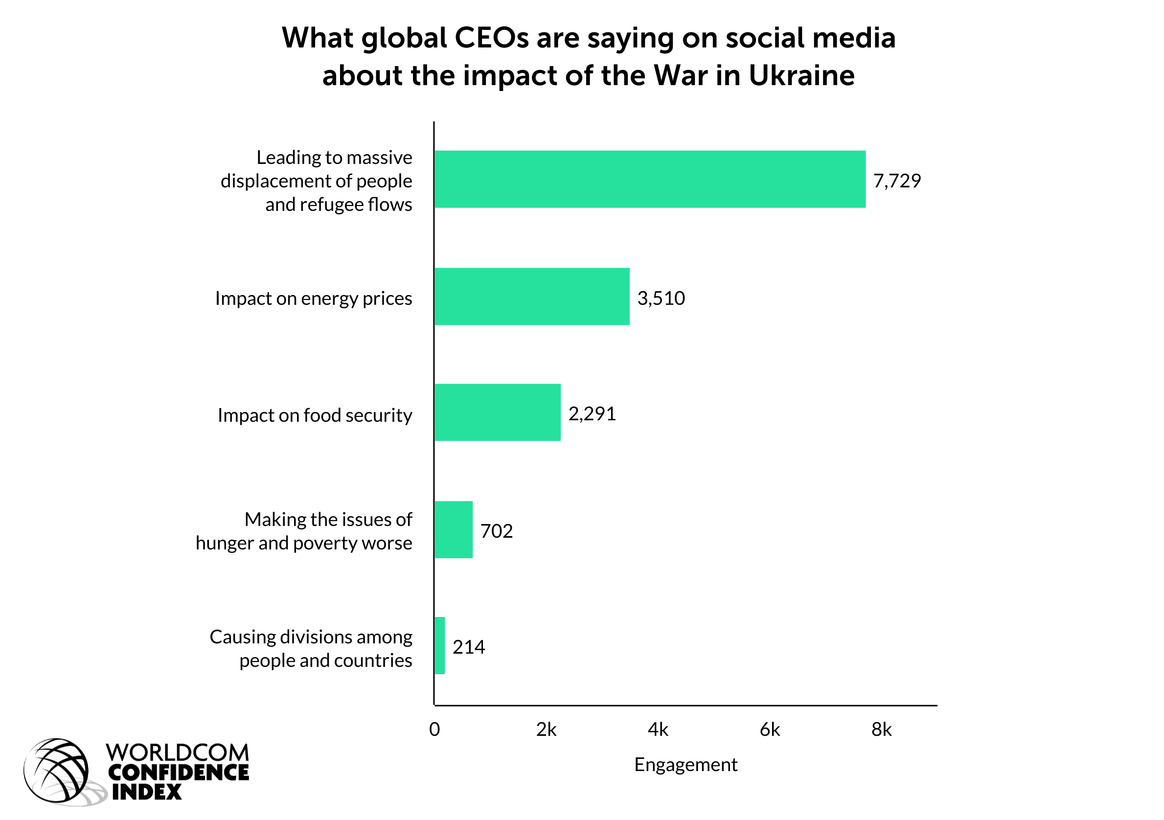 NEW YORK (June 21, 2022) – In a special topic tracking report from the Worldcom Confidence Index (WCI) of what CEOs are saying about the impact of the War in Ukraine, The Worldcom Public Relations Group (Worldcom) has identified five main topical issues that global CEOs and CMOs are talking about. In the period between February and May 2022, the top five topics are: The massive displacement of people and refugee flows; the impact on energy prices; the impact on food security; making the issues of hunger and poverty worse; causing divisions among people and countries.
