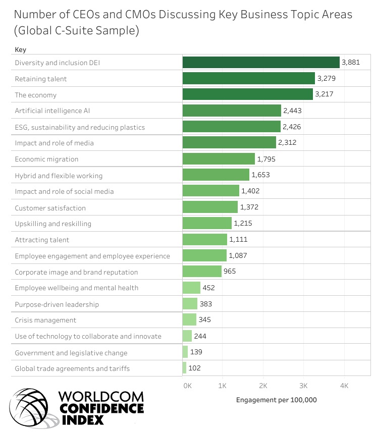 The Worldcom Confidence Index (WCI) is the first AI-driven ‘living’ global market research, tracking the topics that over 80,000 CEOs and CMOs are commenting on online. The AI-fuelled tracker is updated monthly and is drawn from an active sample of over 100,000 C-Suite executives. It tracks data for two roles, six regions, 42 countries and 11 industry sectors. It identifies the levels of engagement with business topics and how much the level of confidence for each topic has changed. It is the first global study of this type to use AI supported data capture.