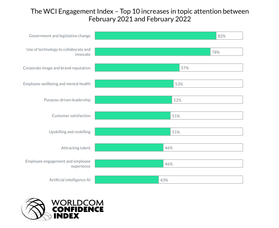 While the Top 10 topics in the Index remained the same, six business topics outside the Top 10 saw a surge in the number of business leaders engaging with them – all increasing by over 50% since February 2021[ii]. Unsurprisingly, with the various government responses to the pandemic, the topic of government and legislative change has the biggest increase in attention – up 82% from February 2021.