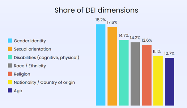 The diversity dimension that features most often in the Region is Gender Identity (18.2%). This appeared 64% more often than Nationality (11.1%). While Age and Nationality had the lowest share, the fact that they appear so frequently shows that any DEI policy should take account of all these dimensions, especially in the light of people working longer and increases in economic migration. Sexual orientation was the second most commonly occurring topic (17.6%), followed by Disabilities (14.7%), Race/Ethnicity (14.2%), Religion (13.6%), Nationality (11.1%) and Age (10.7%) – see chart 2[ii].