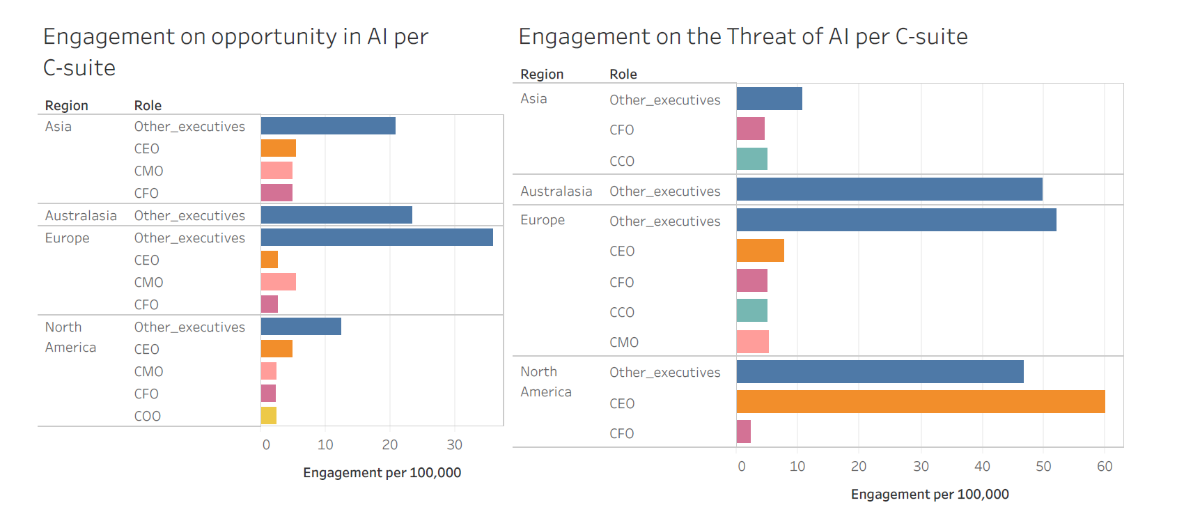 2. The threat of AI is attracting more attention than the opportunity of AI. 12 times as many CEOs in North America engaged with the threats of AI than the opportunities.