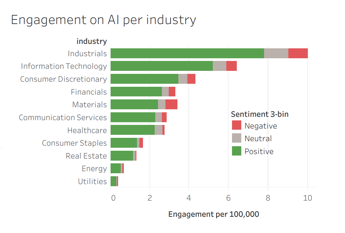 3. The three most engaged sectors are Industrials, IT and consumer discretionary. Ten times as many leaders in the Industrials sector are engaged with AI than their peers in Utilities.