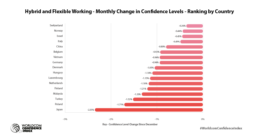 The WCI provides insights for 42 countries where the Worldcom PR Group has partner offices. The results show some interesting differences to the global results at a local level. For example, in Brazil confidence in Diversity, Equity and Inclusion in January has increased by 4.04%[ii] but fallen in Poland by 1.23% since December[iii]. In Portugal, confidence has increased in hybrid and flexible working by 2.16%[iv] but fallen in Japan by 2.35% over the same period[v]. In depth results are available from our local partners from Argentina to Vietnam.